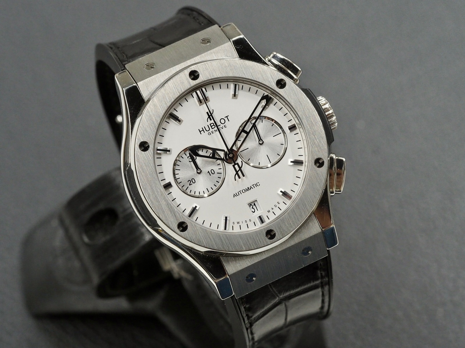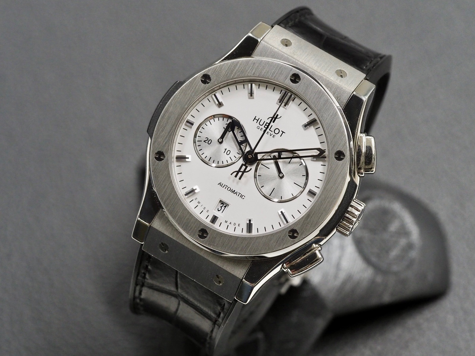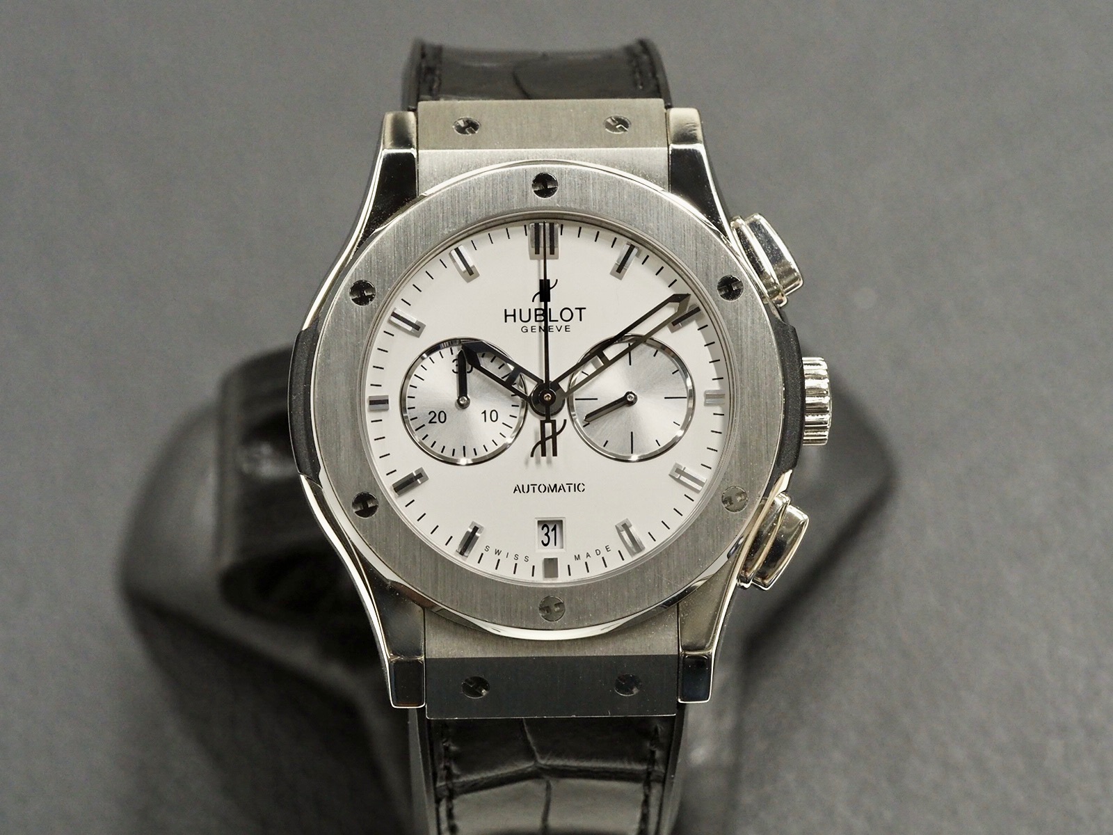 A great condition 42mm Hublot Classic Fusion Opalin Chrono, ref. 541.NX.2610.LR. Stylish sports watch in titanium. Box and undated papers, service papers 2/2024. 12 months warranty.