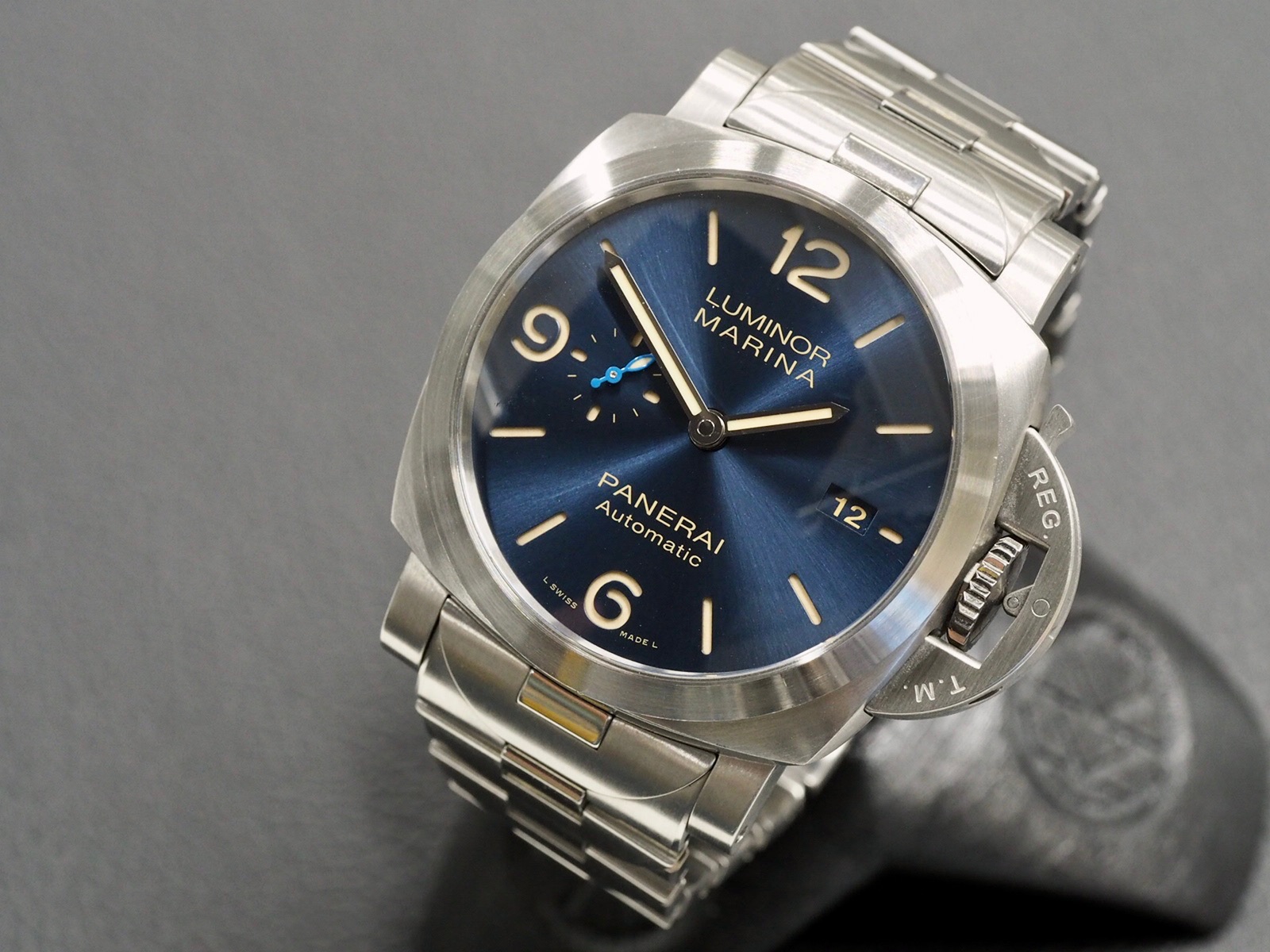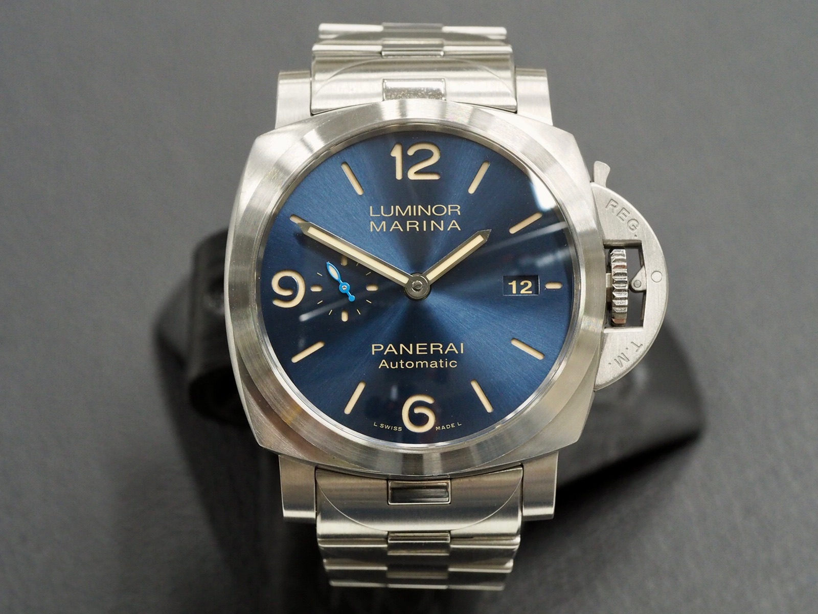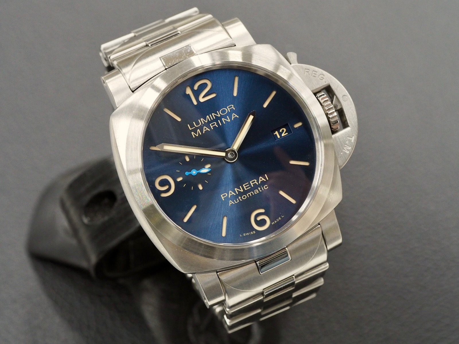 A great condition 44mm Panerai PAM01058 Luminor Marina. Stylish sports watch with gorgeous blue dial and metal bracelet. Complete set 12/2019. Servived under warranty 4/2024. 12 months warranty.