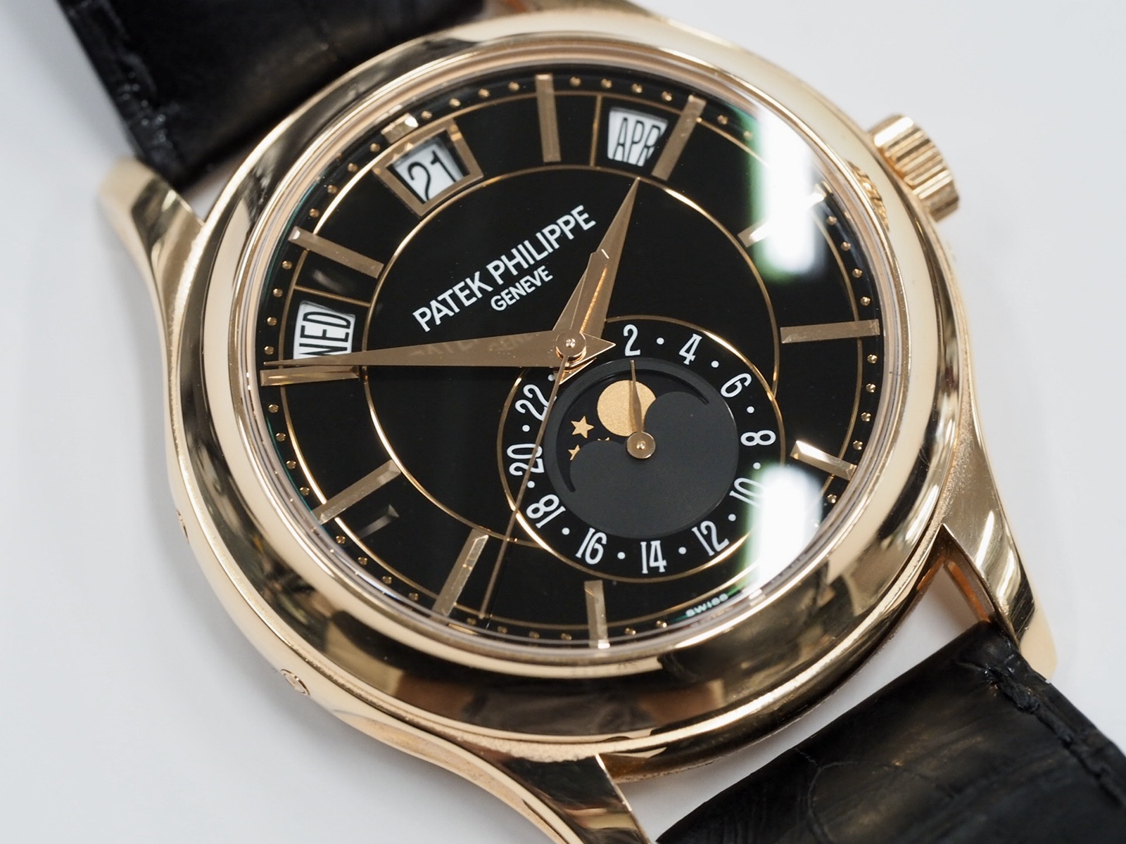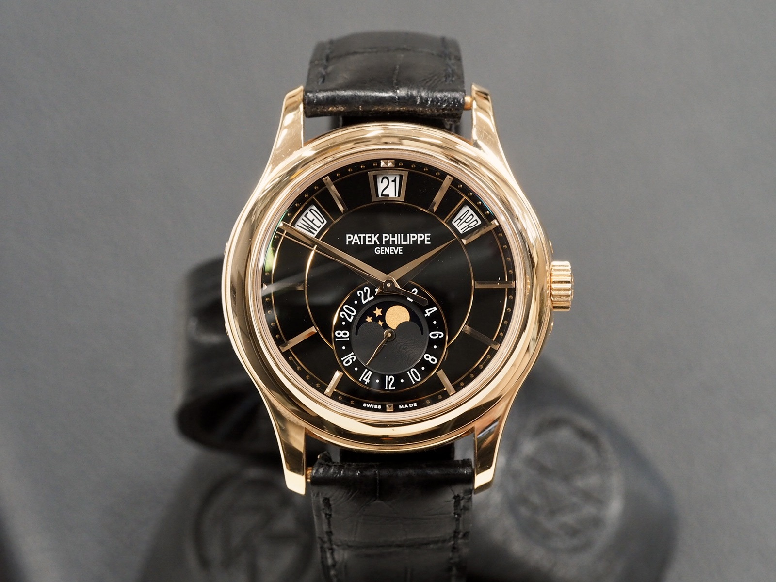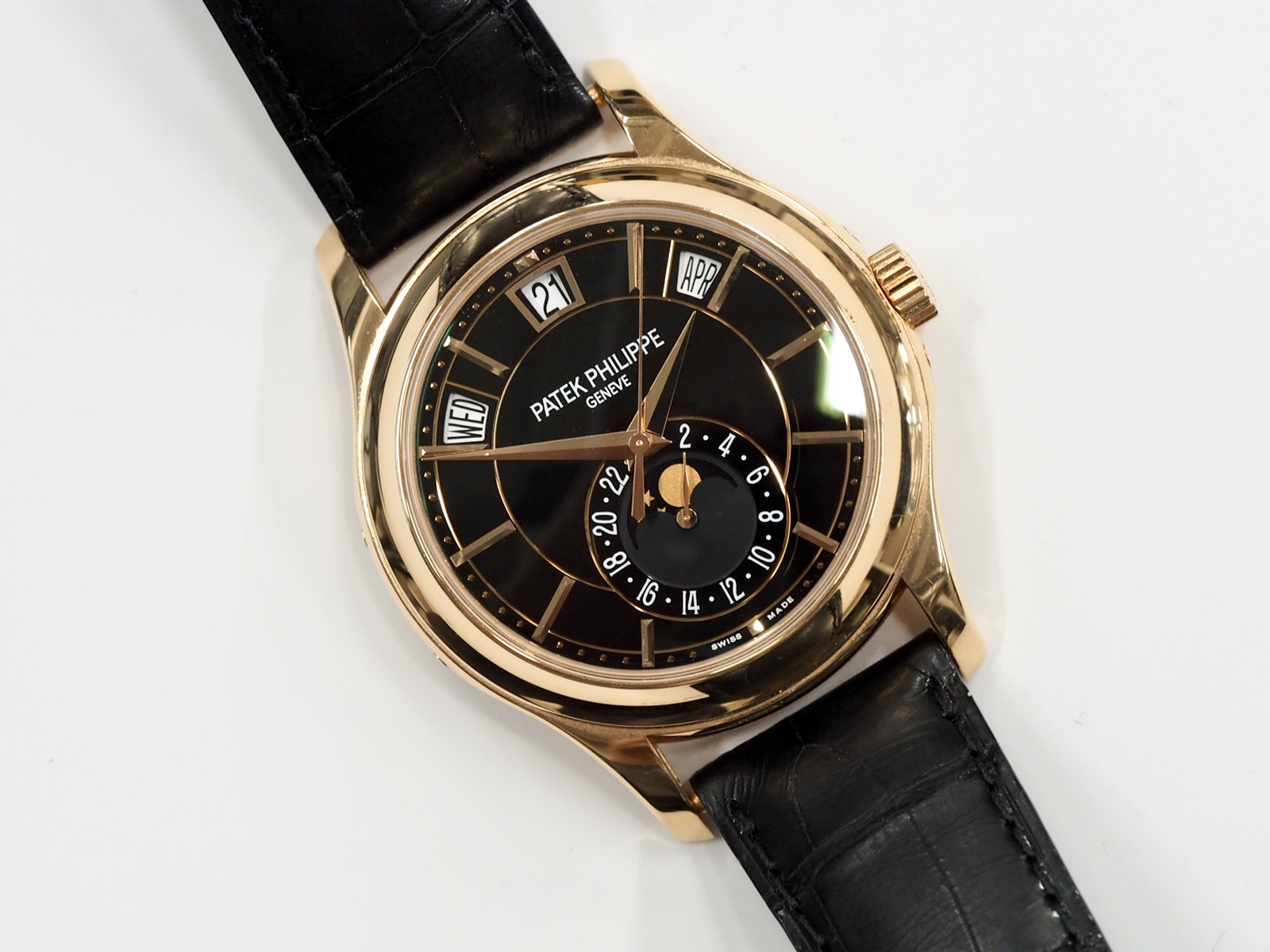 A very classy 40mm Patek Philippe 5205R in rose gold. Comes with original boxes and papers which are dated 2014.