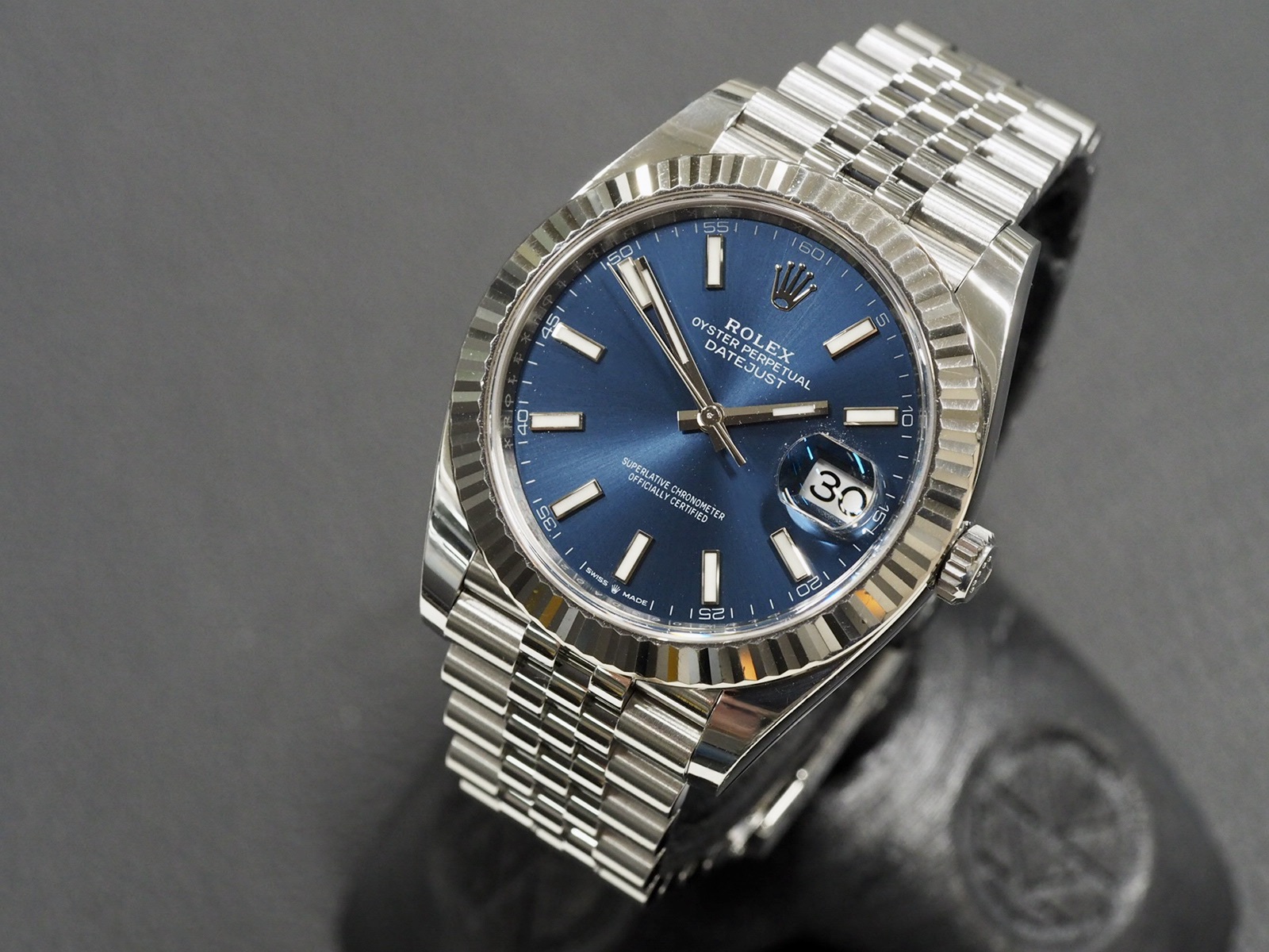 An good condition 41mm Datejust 41mm with a beautiful blue sunburst dial, white gold bezel and Jubilee bracelet. Complete set 3/2021, serviced 1/2026.