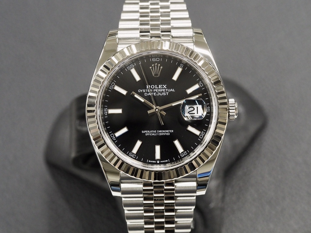 An excellent condition 41mm Datejust 41mm with a classy black dial, white gold bezel and Jubilee bracelet. Complete set 8/2020, Rolex serviced 12/2025