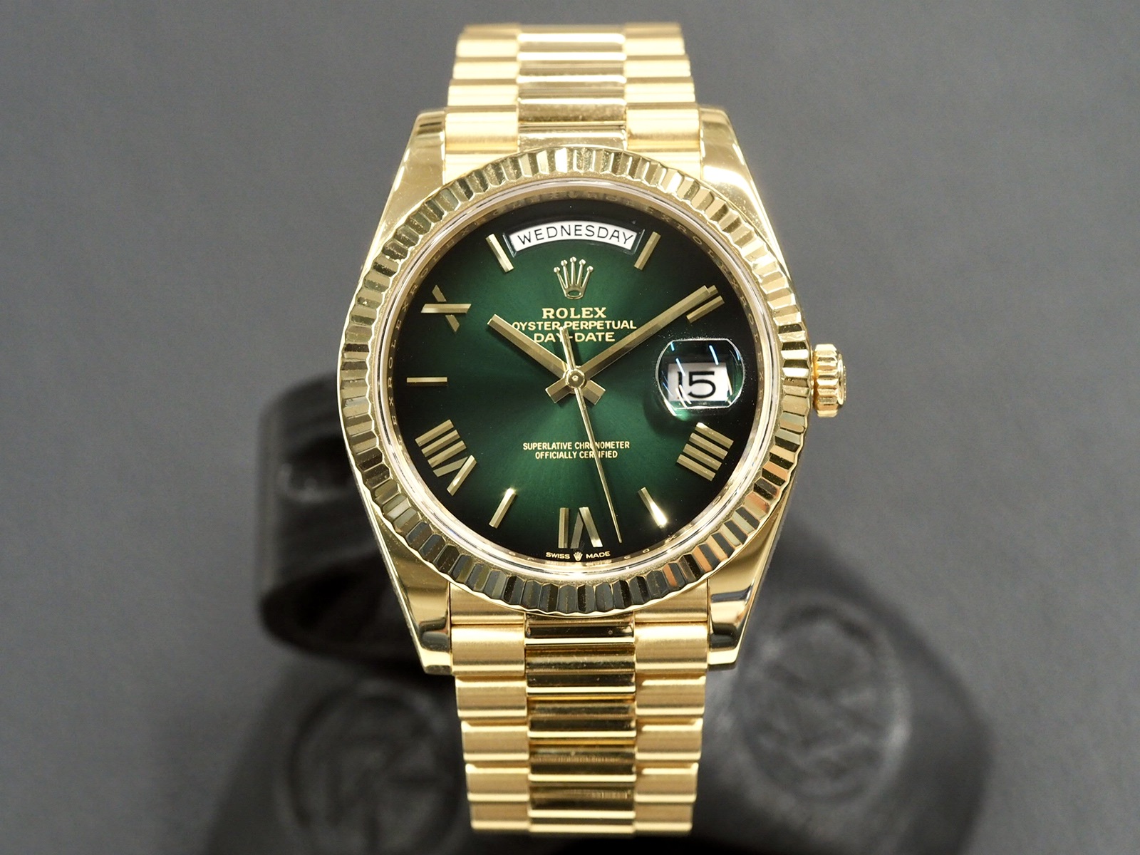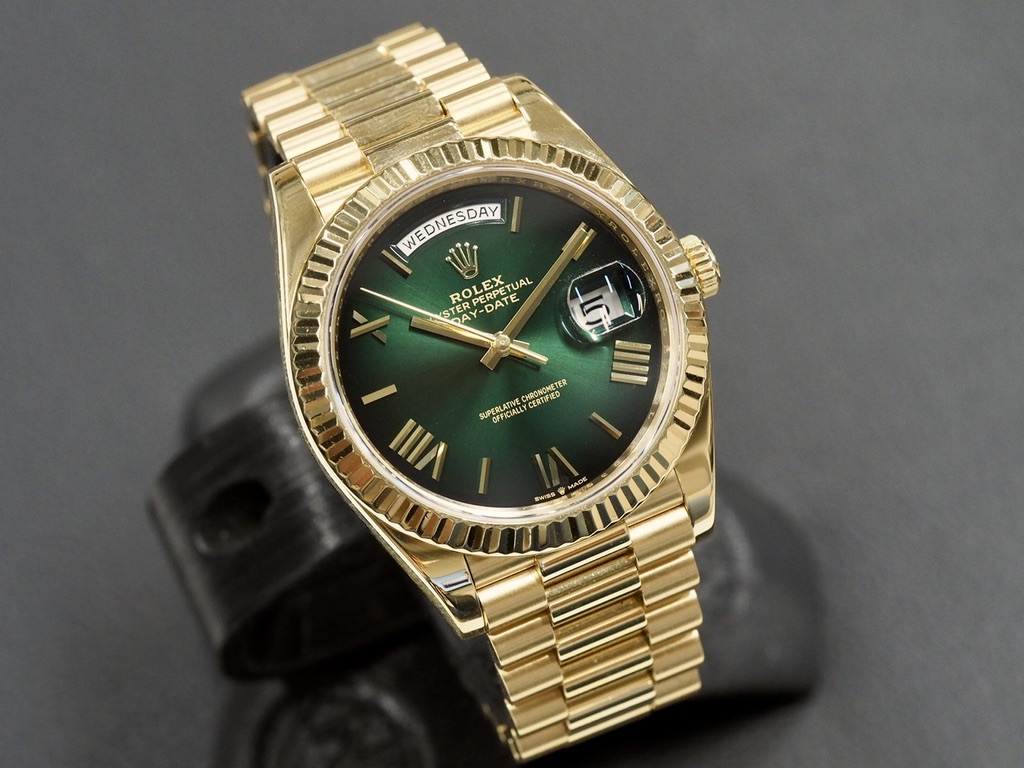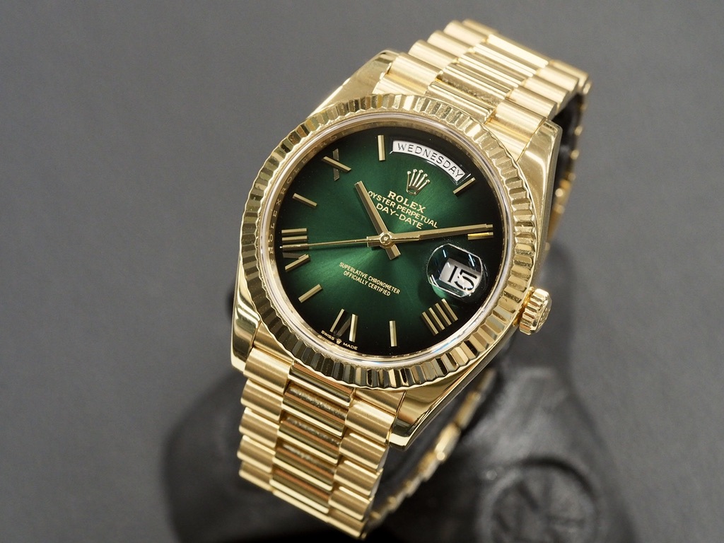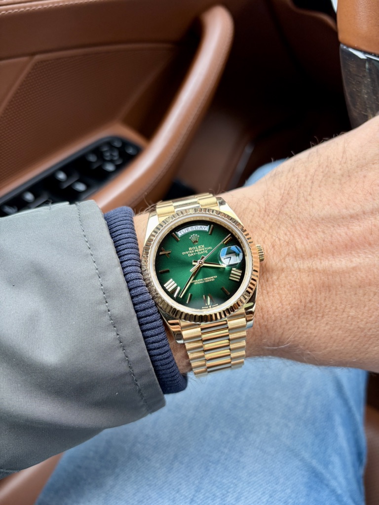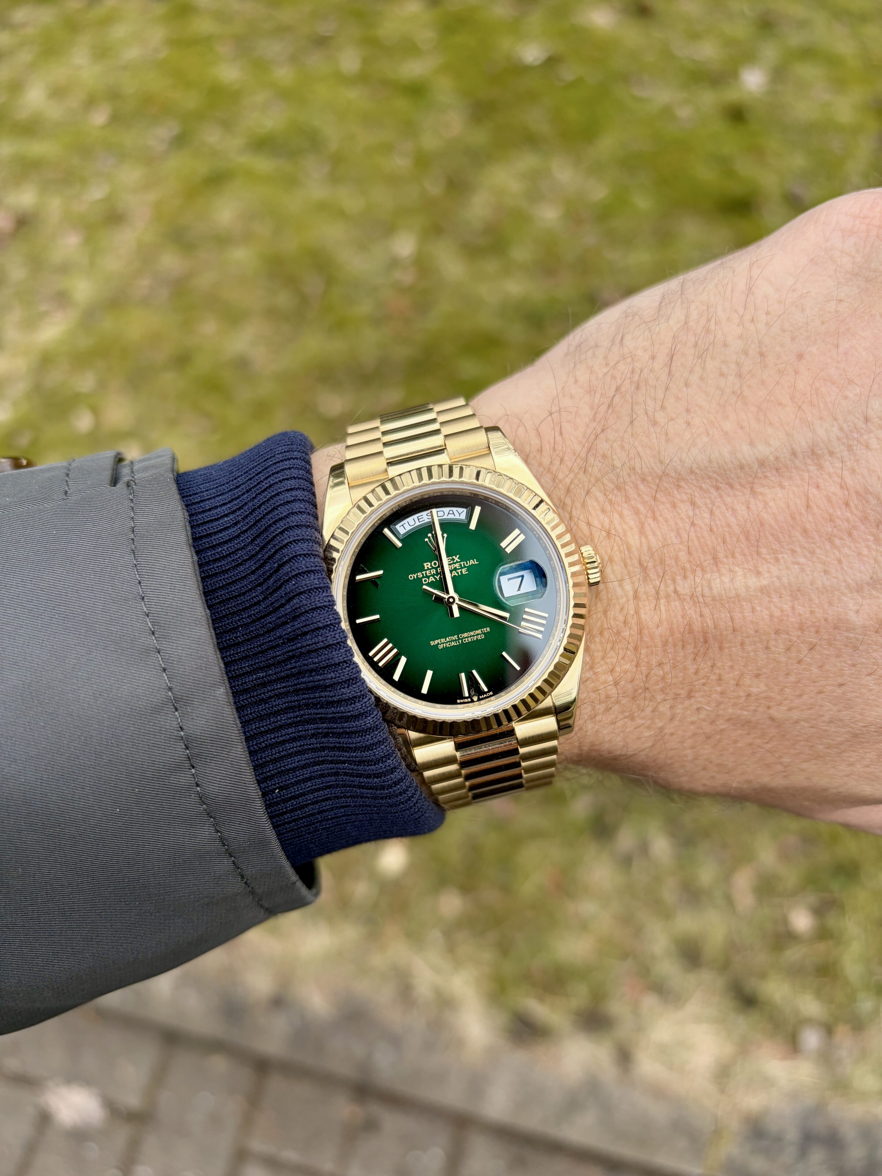 A good condition 40mm Day-Date in yellow gold. Complete set 2016. Rolex serviced 10/2025 and under warranty until 10/2027. The ombre green dial is installed on the watch at official service center.