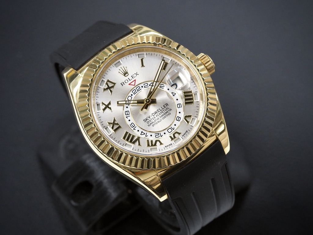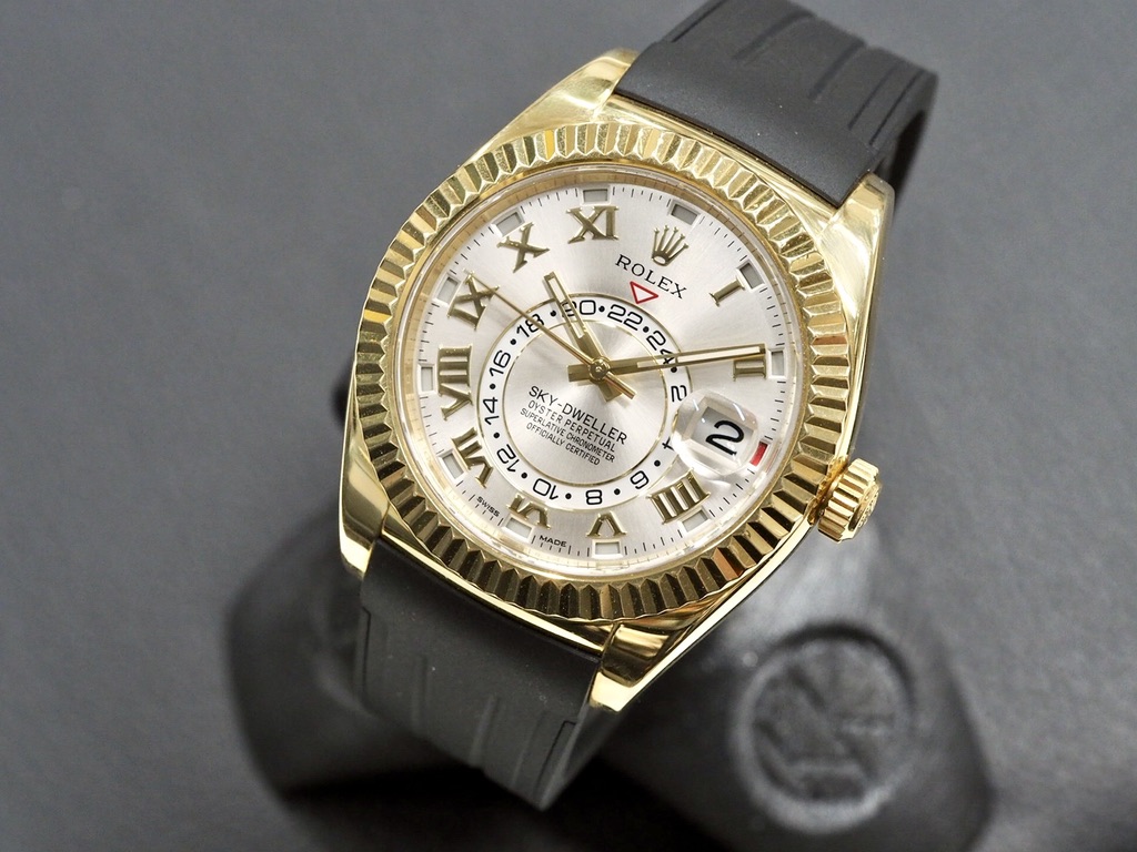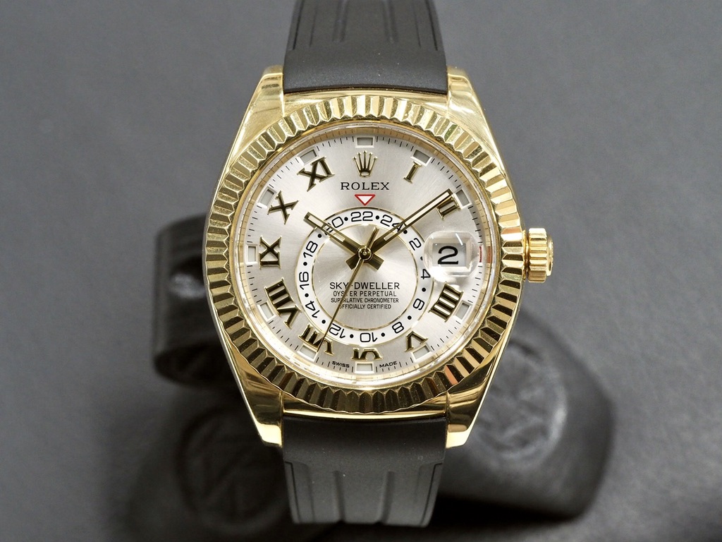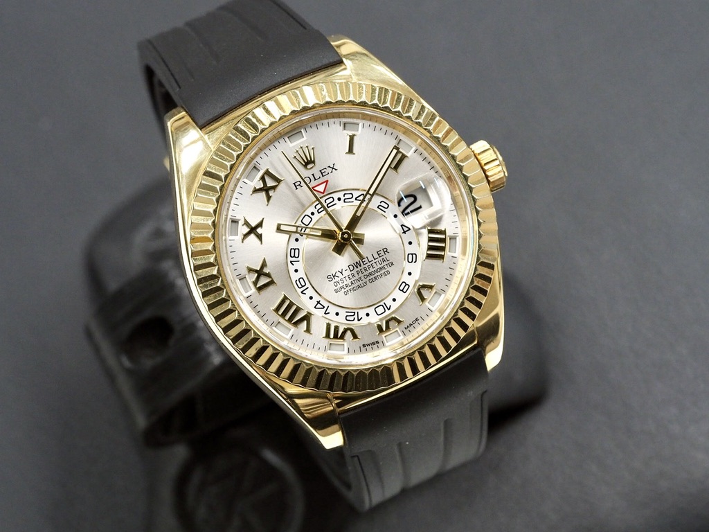 Hyväkuntoinen 42mm Sky-Dweller keltakultakuorella ja tyylikkäällä hopeisella sunburst-taululla, jossa kultaiset indeksit ja osoittimet. Koneistona Rolexin inhouse 9001-automaatti, jossa 70h käyntivara, toisen aikavyöhykkeen näyttö ja vuosikalenteri. Kalenteri vaatii säätöä vain kerran vuodessa ja tunnistaa lyhyet ja pitkät kuukaudet. Rannekkeella RubberB:n mukava kumiranneke Rolexin alkuperäisetllä kultalukolla – mukana myös alkuperäinen tummanruskea alligaattoriranneke. Alkuperäinen laatikko ja paperit, jotka päivätty 6/2016. Nykyinen listahinta 49300 €