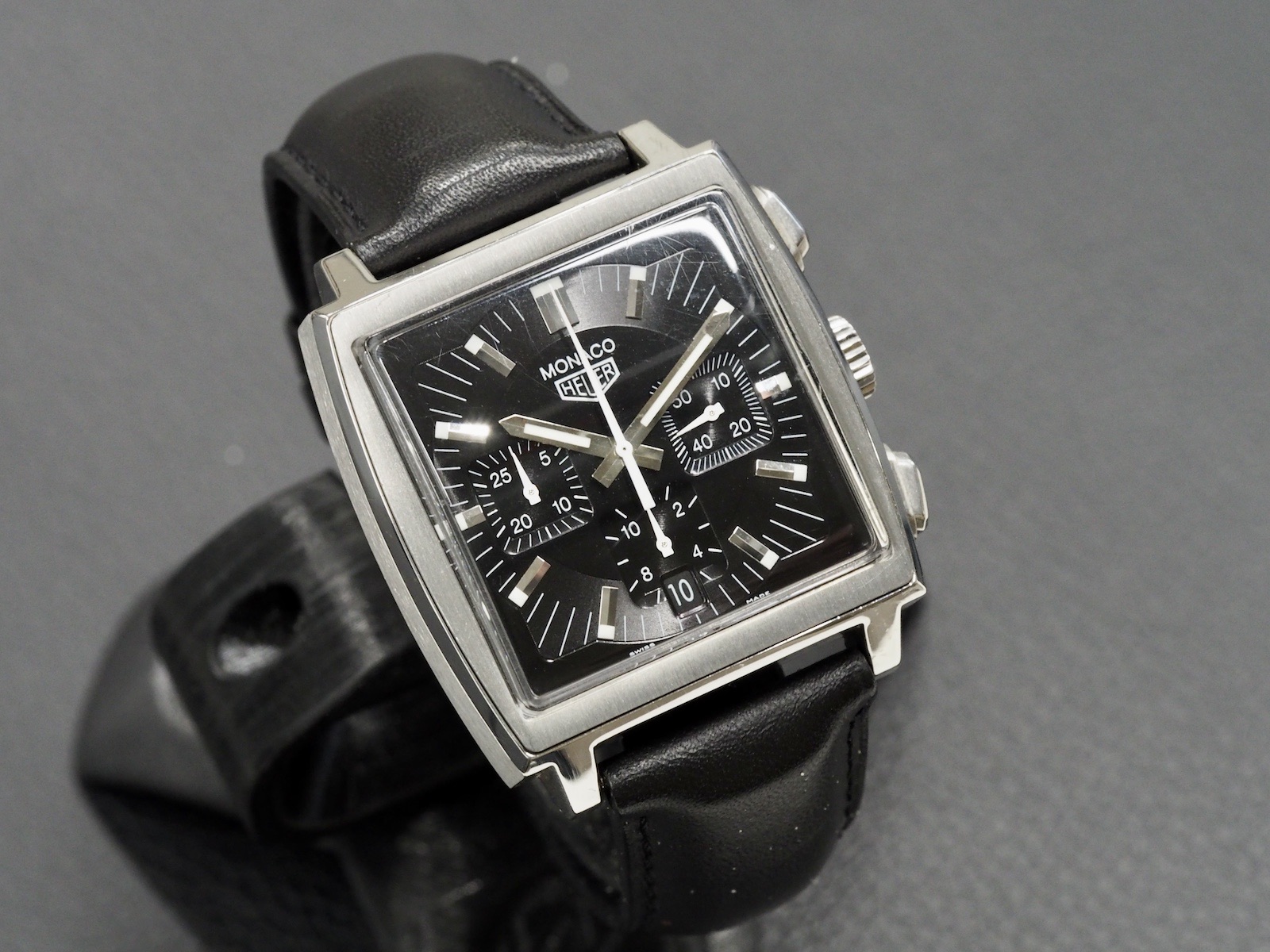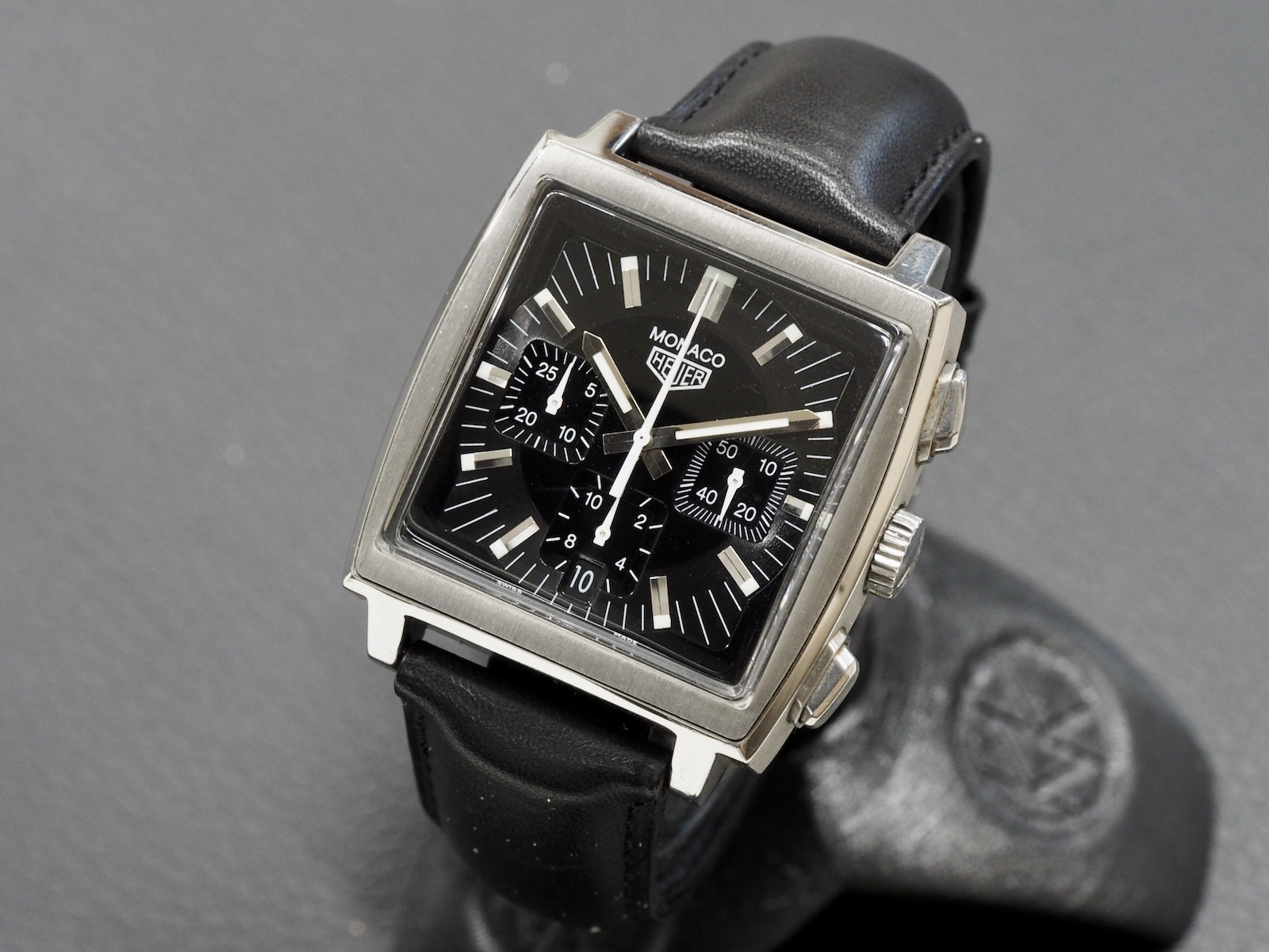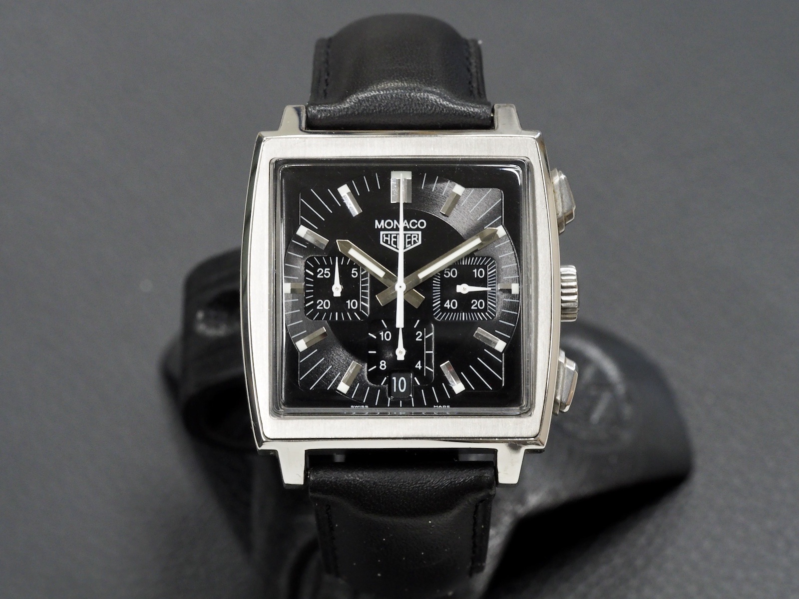 Great condition 38mm TAG Heuer Monaco, ref CS2111. Stylish Monaco chronograph with black dial. Watch, box and undated and untapped warranty card. The movement has been checked and the watch runs well. 12 months warranty.